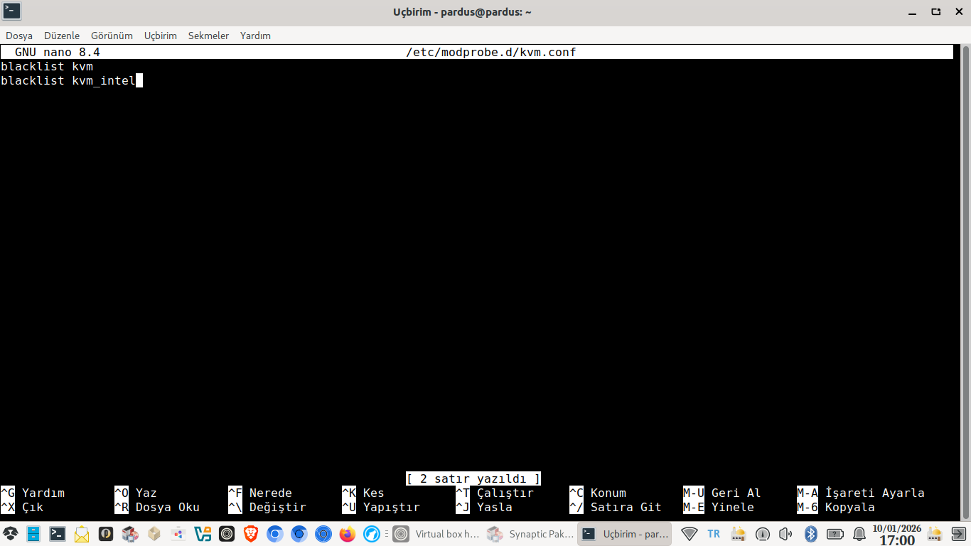 sudo nano /etc/modprobe.d/kvm.conf komutunu çalıştırın.