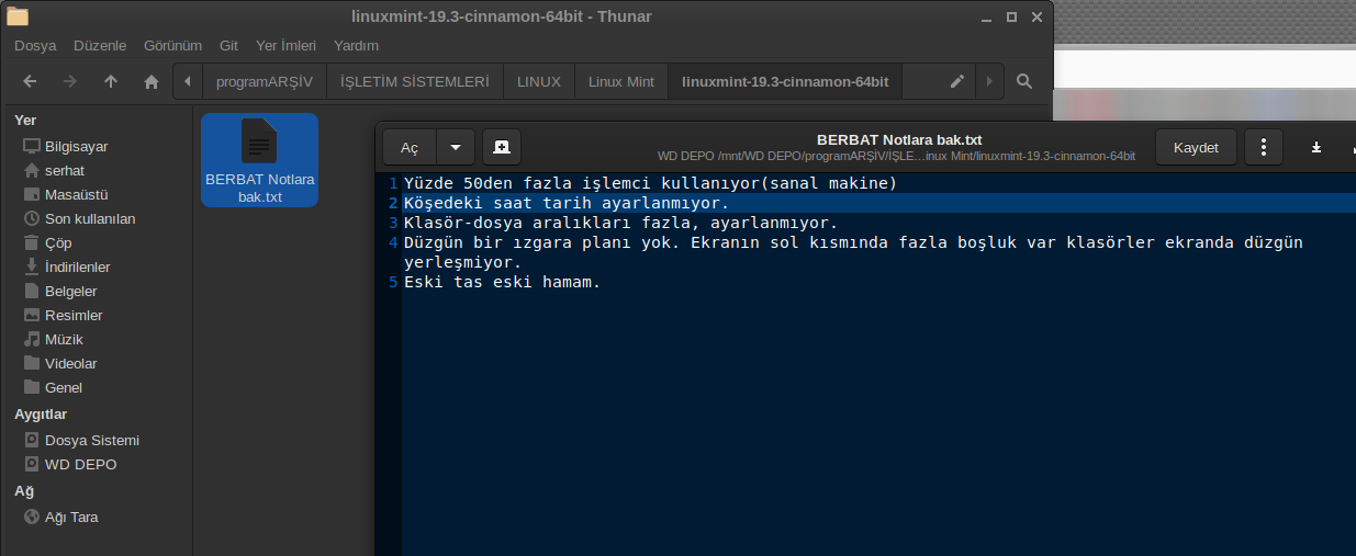 Fedora, Arch gibi dağıtımları hiç kullanmadığım için huyunu suyunu bilmiyorum. Ama Linux Mint’i 2 yıl kadar kullandım, sorunları vardı. Geçen yıllarda yine denedim hala aynı. Özelleştirmesi kısıtlı. Hydrogen diye bir müzik yapma programını kurdum, sistemdeki kodekleri kaldırdı, bir daha kuramadım format atmak zorunda kaldım. Masaüstündeki simgeler birbirine çok uzak ve hizalama sorunu var. İyice dibe yaklaşmıyor. Masaüstünün en kenarında birkaç santimlik bilinmeyen bir boşluk var. Conky kurduğum zaman en kenara yaklaştırılamıyordu. Hatta bak şimdi arşivden buldum hakkında notlar almışım: