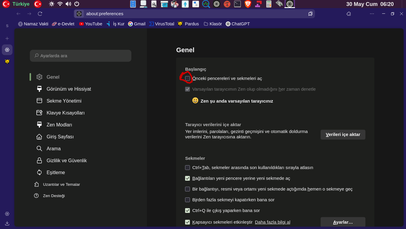 Tarayıcıyı açtığımda en son sekmeleri yüklüyor . Önceden sanki bunu ayarlayabiliyordum . Şİmdi bu ayarı bulamadım .